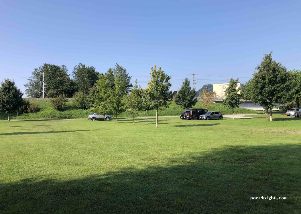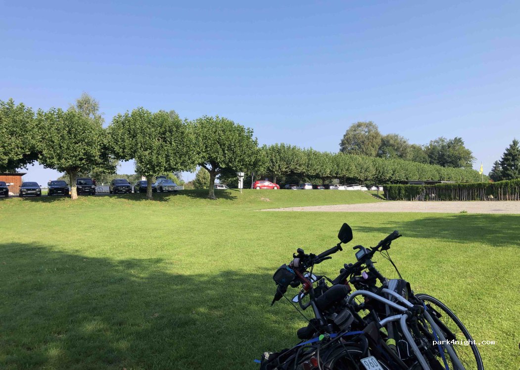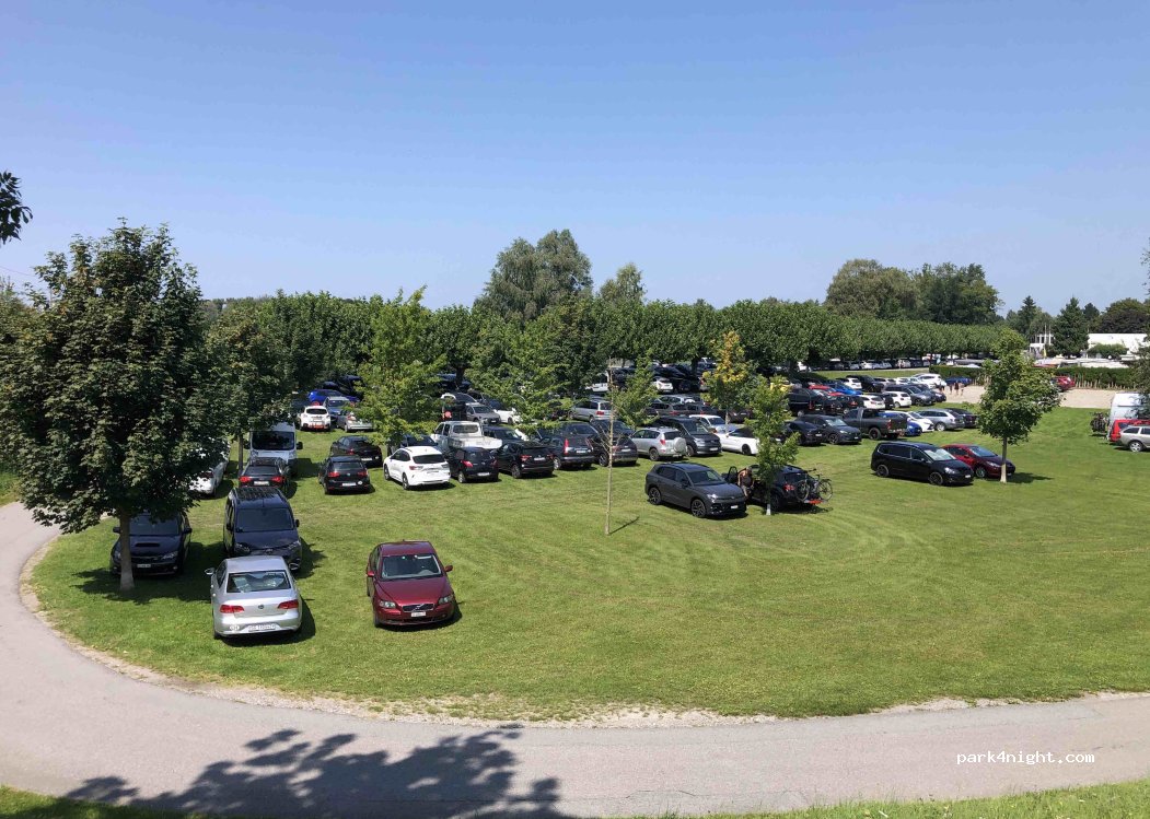 A large meadow parking lot for the public swimming pool, directly adjacent to the very clean but narrow Bruggerhorn campsite. There are a few trees providing shade, and the grass could potentially get muddy in heavy rain. However, there are a few parking spaces on paved ground along the driveway. There was a small sign prohibiting camping that was easy to miss, but it only applied to tents. No one was bothered by our motorhome. Of course, you shouldn't unpack the table and chairs or extend the awning. It should look like you're parking for the swimming pool.