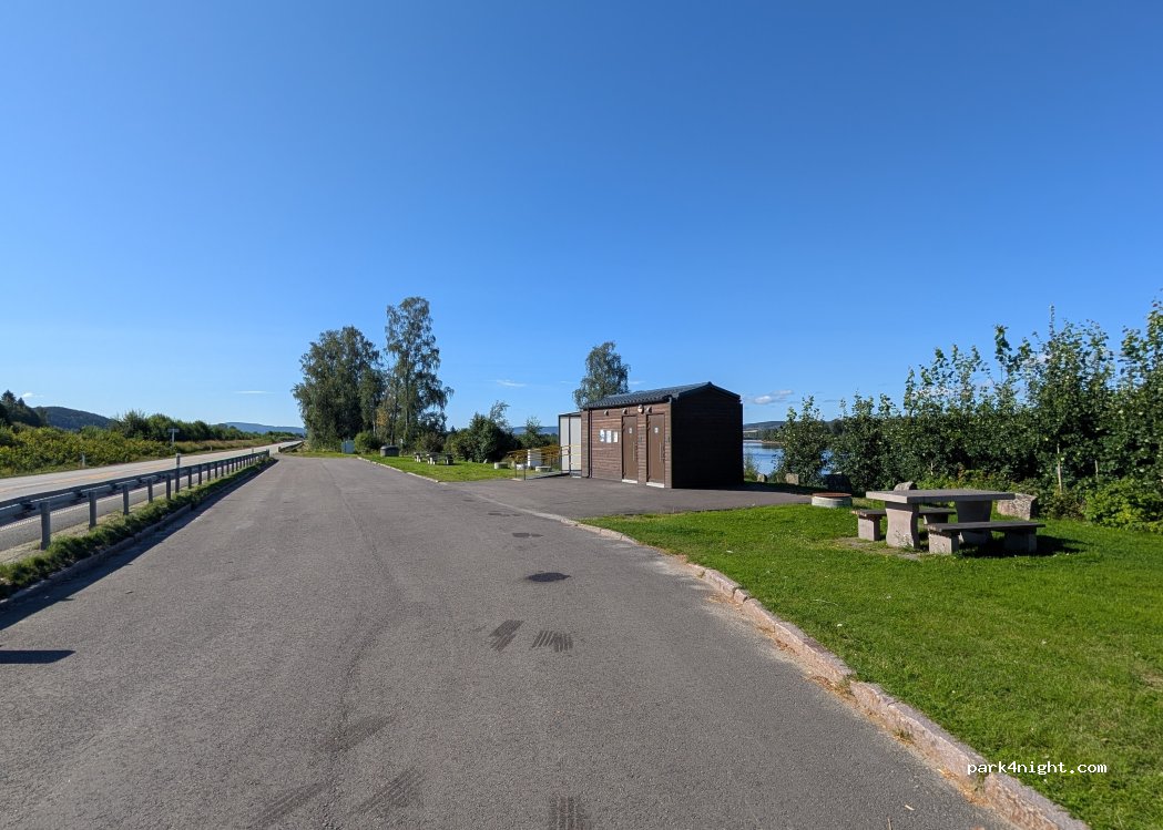 Área de descanso junto a la carretera y la vía férrea. Baños públicos, mesas de picnic y papelera. Hermosa vista de Glomma. No hay señales de aparcamiento. Caravanas y remolques suelen pernoctar aquí.