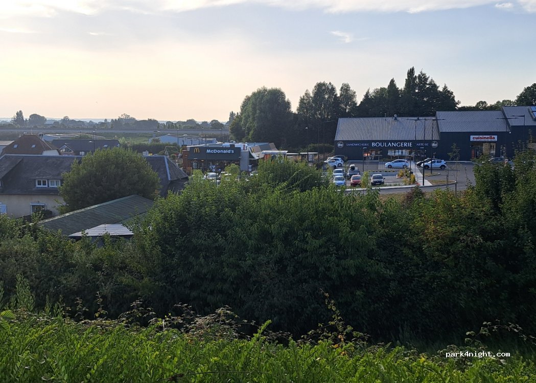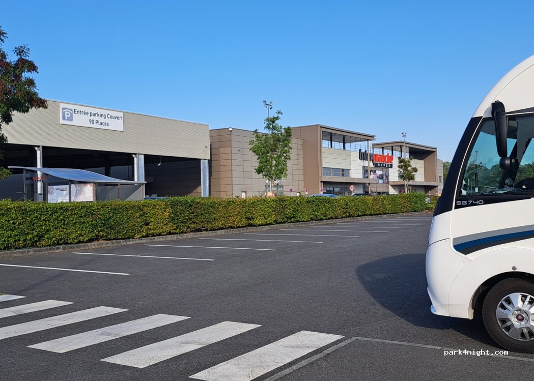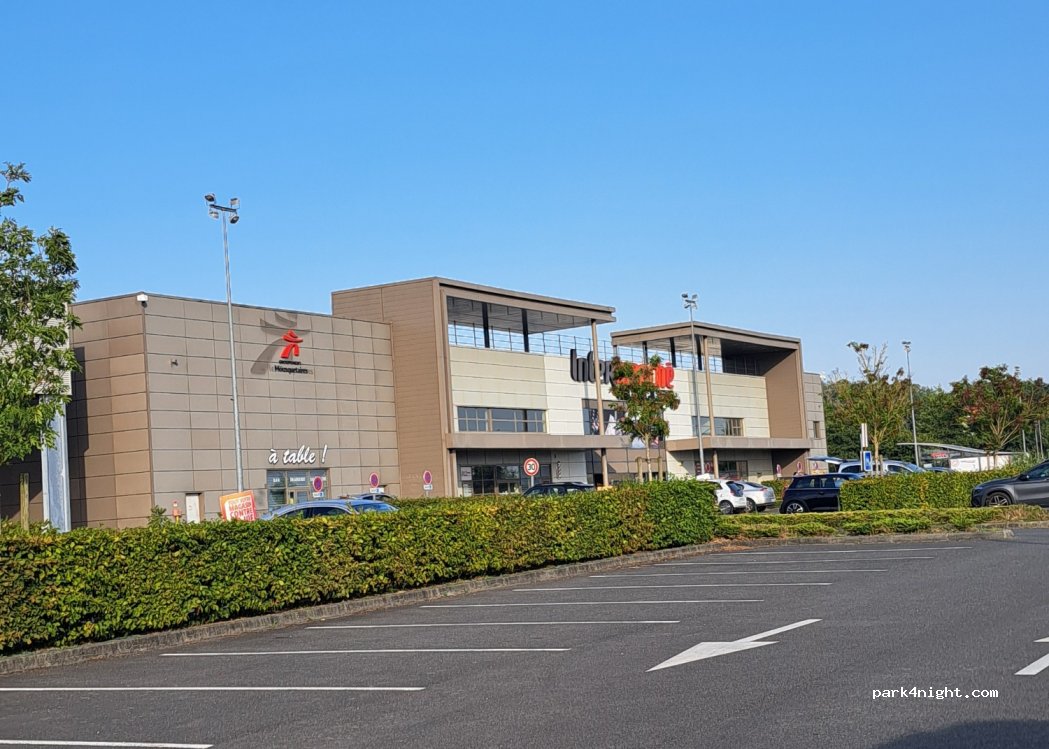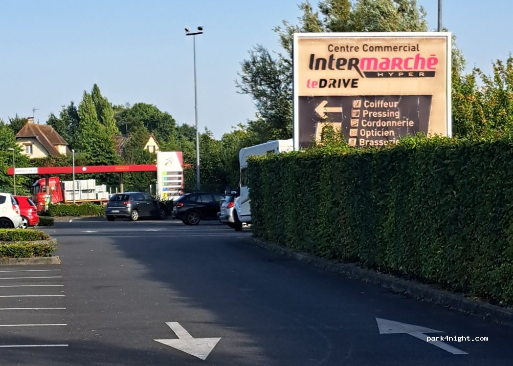 Intermarché parking possible to stay overnight no service, gas station ⛽️ laundromat, gas, restaurants. We had a quiet night, to return take the 2nd entrance which is flatter