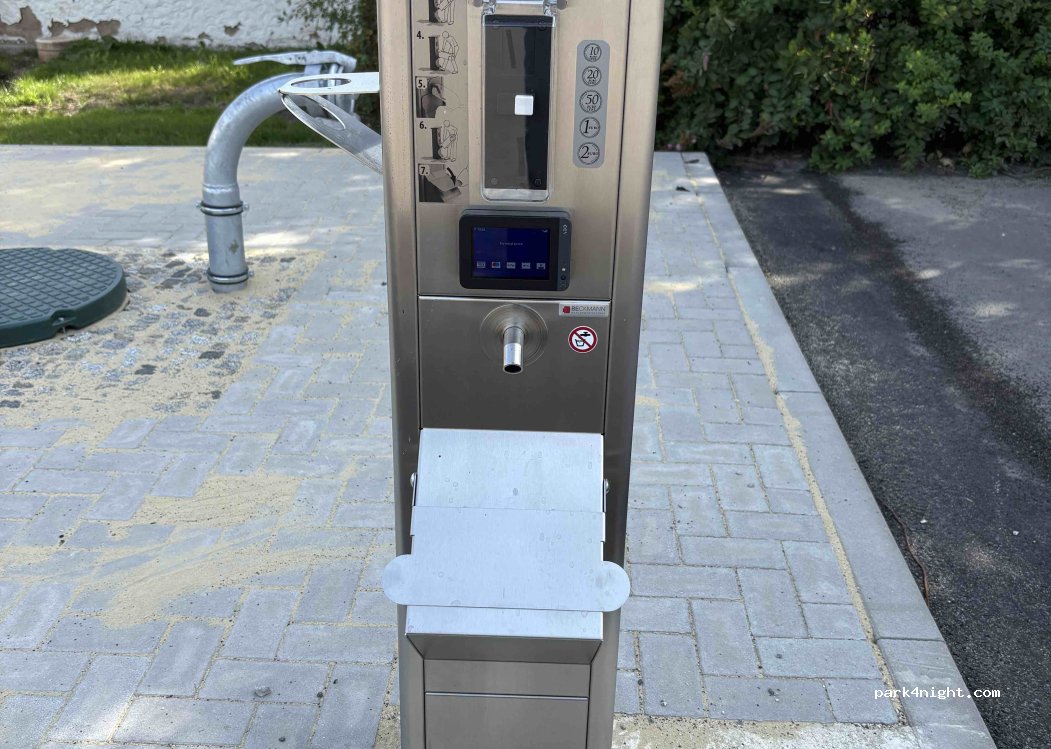 Positiv: - Schöner, großer Platz an der Eissporthalle. - Moderne, funktionierende Ver- und Entsorgung mit Liter-Zähler bei Frischwasserentnahme - auch 10, 20, 30, 40 und 50 Liter-Entnahme Negativ: - laut, wenn Spiele in der Eissporthalle - zwar 15 Minuten freies Parken, aber Ent- und Versorgung ist in dieser Zeit unmöglich => 10 €, weil Wohnmobil (7m) = Bus! - keine Müllentsorgung!