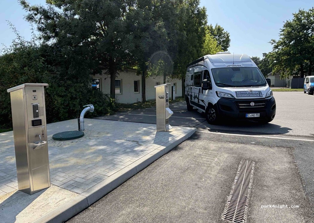 Nouvelle aire de stationnement pour camping-cars avec station de collecte des déchets à Chemnitz. Accès par la Wittgensdorfer Straße, au niveau du centre de sports de glace Jutta Müller. Entrée par barrière, 15 minutes gratuites.