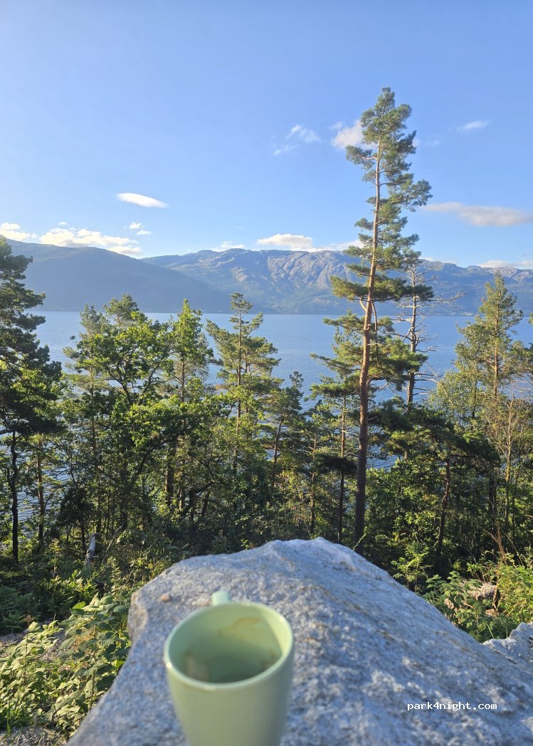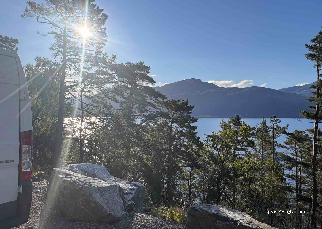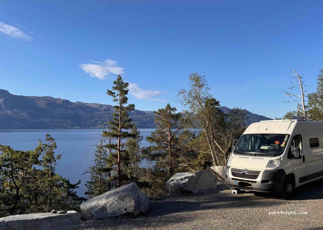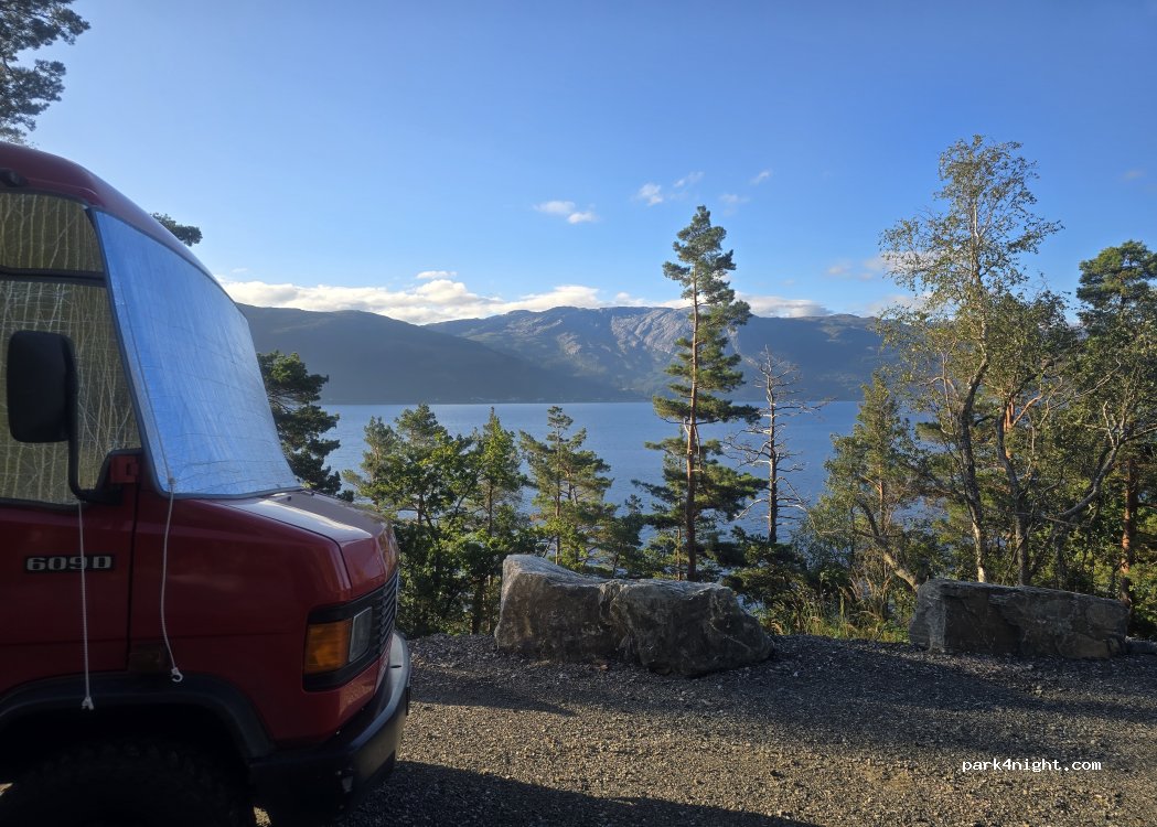 Emplacement en bord de route, délimité par du béton. Route calme. Vue sur le Hardangerfjord. Accès par Kvandall, et non par Bergen, surtout avec un long camping-car. Faire demi-tour un peu plus loin.
