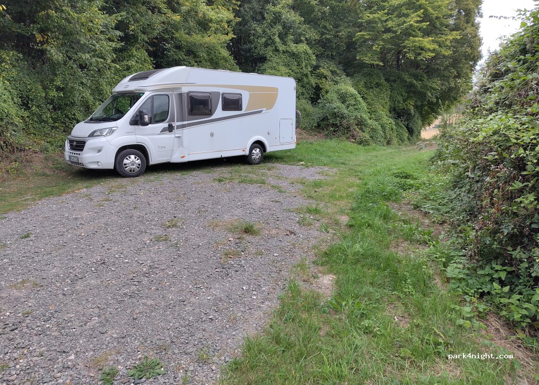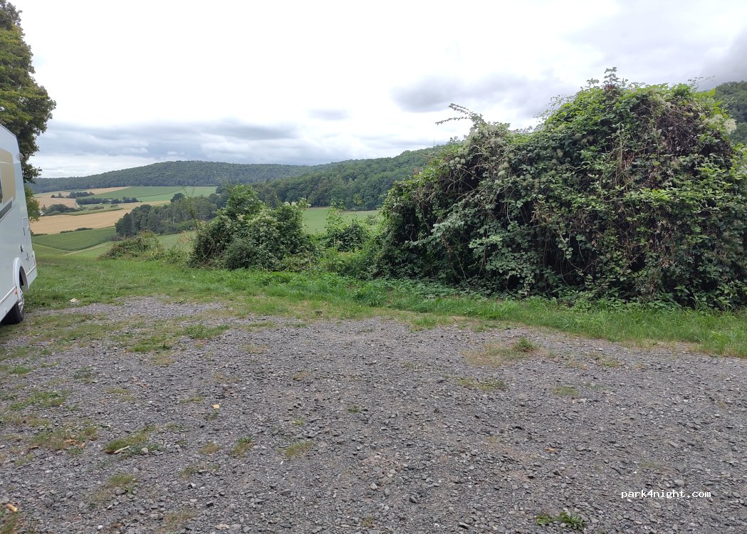 Geschotterter Platz mit etwas Aussicht. Recht eben. in der Nähe der kugelsburg wo Toiletten vorhanden sind. außerdem ist in der Nähe das Schwimmbad. Platz für zwei wohnmobile.