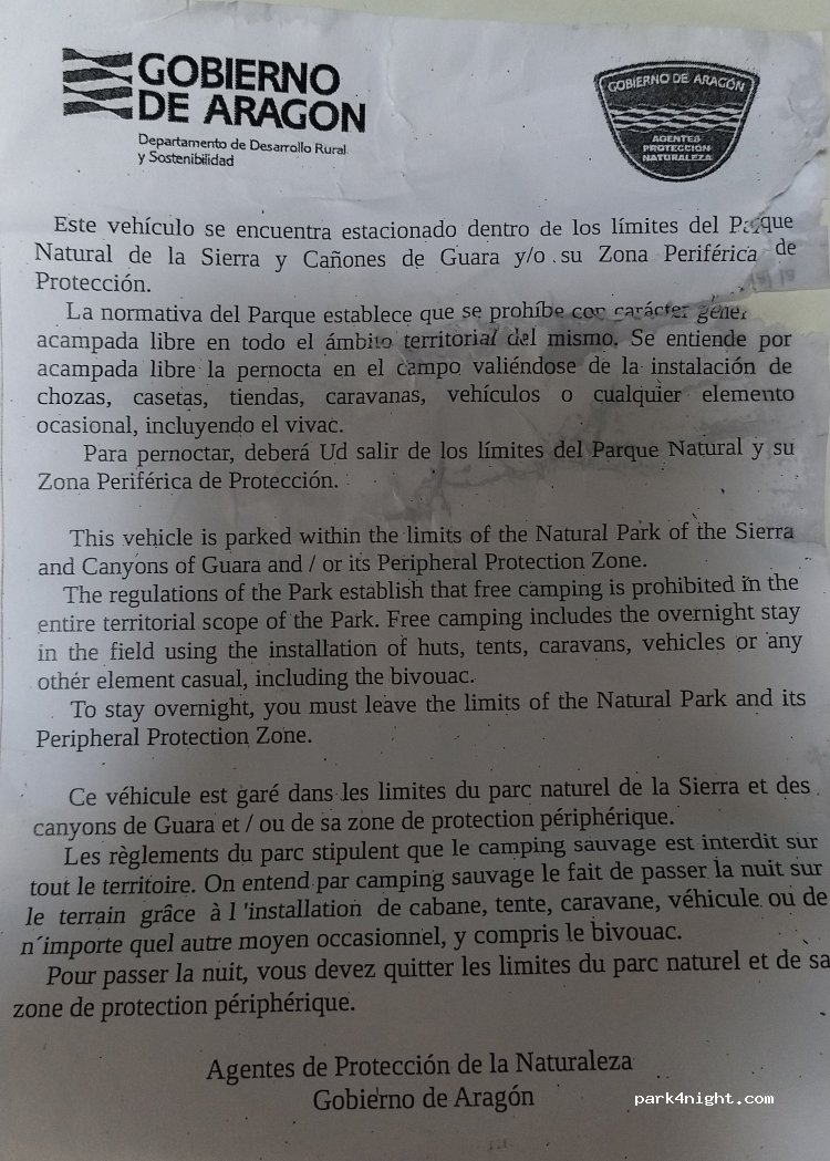 Parking de inicio de senderos, escalada y via ferrata. Paneles informativos. Pero al estar en un Parque Nacional, no se puede pernoctar. Recibo a este respecto un aviso en el parabrisas de mi RV.