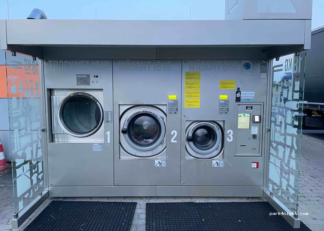 There are free toilets and free shower at the truck parking behind hotel /restaurant. Also there are washing machines: big 10 euro, medium 5, little was not displayed. Water is available for free to fill tanks. Toilets at petrol station 0.50.