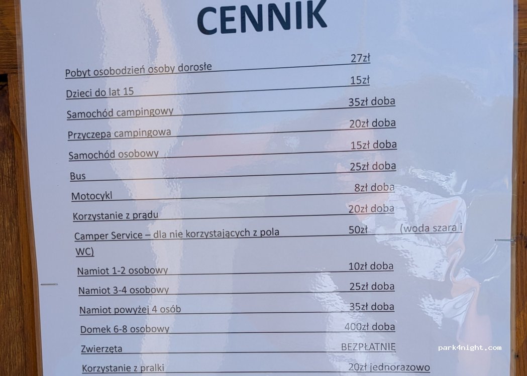 Stayed here one night. 25PLN camper, 12PLN for two people and 10PLN for waste and grey water. Really nice spot, very quiet when we stayed.