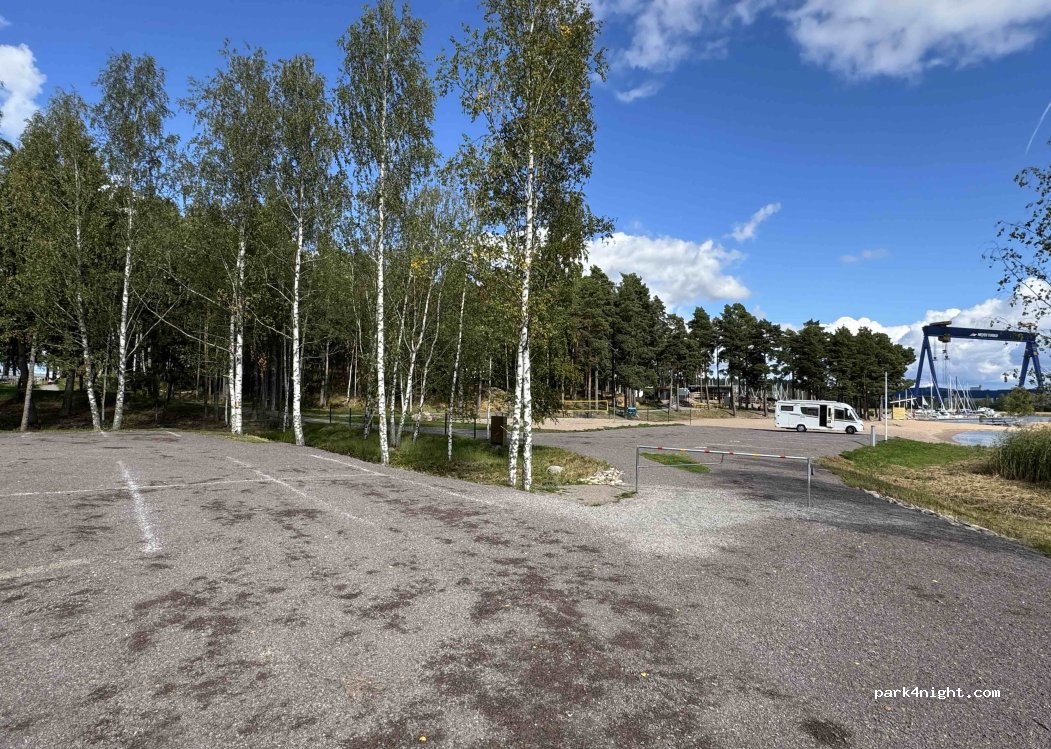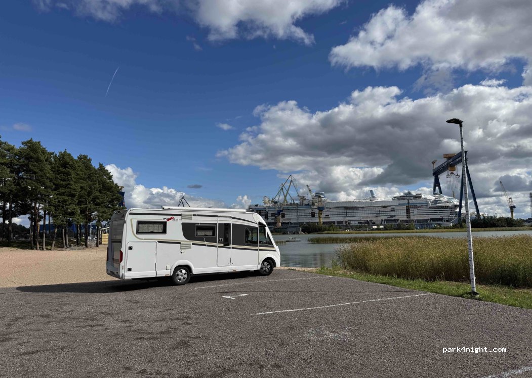 Via de app Matkaparkki zijn 6 plekken te reserveren op asfalt aan het fjord en zandstrand met uitzicht op de Meyer werf. Via de app boek je een van de zes plaatsen en op app zie welke nog beschikbaar zijn. Na boeking en betaling ontvang je een code voor het sleutelkastje bij de slagboom. Deze CP bestaat naast de andere CP vlakbij maar is € 3 duurder. Is inclusief WC, chemisch toilet, douche en elektra.
