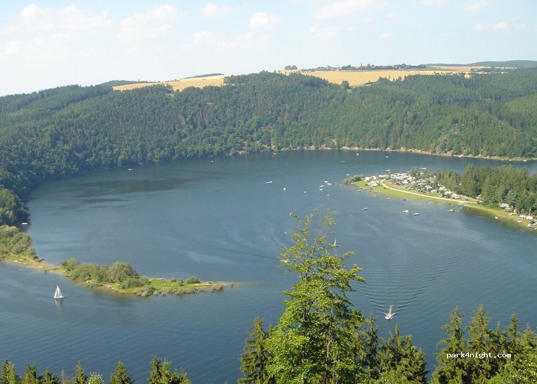 Nuestro camping natural se encuentra junto a uno de los embalses más grandes de Alemania, en medio del verde paisaje de Turingia, en una pintoresca península que se adentra en la extensa bahía del embalse de Hohenwarte.