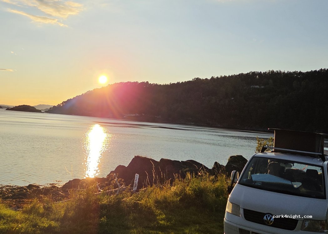 Nahe der Straße. Stellplatz für ein oder zwei Wohnmobile. Schöne Aussicht auf den Fjord mit herrlichem Sonnenuntergang. Es ist ein kleiner Platz mit Gras. Am Rande gibt es große Felsen, an denen man angeln oder schwimmen kann. Es gibt sogar eine Feuerstelle und viel Holz. Toller Platz!