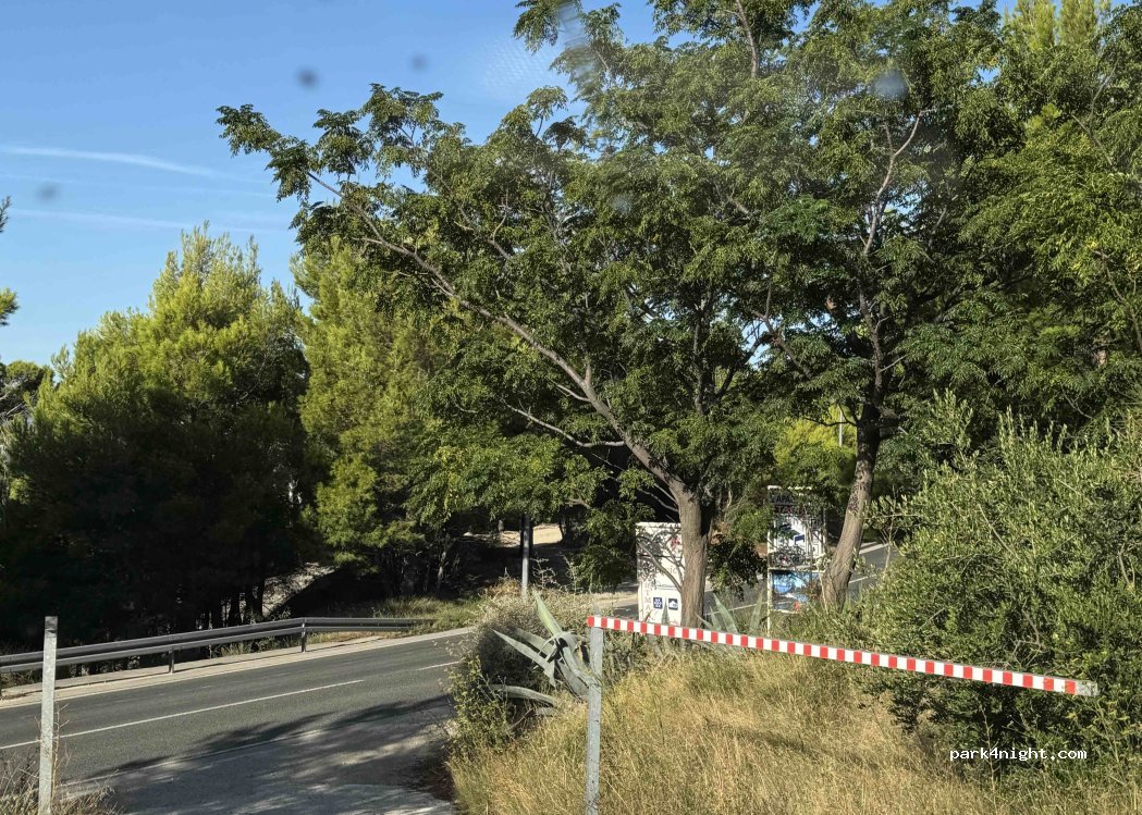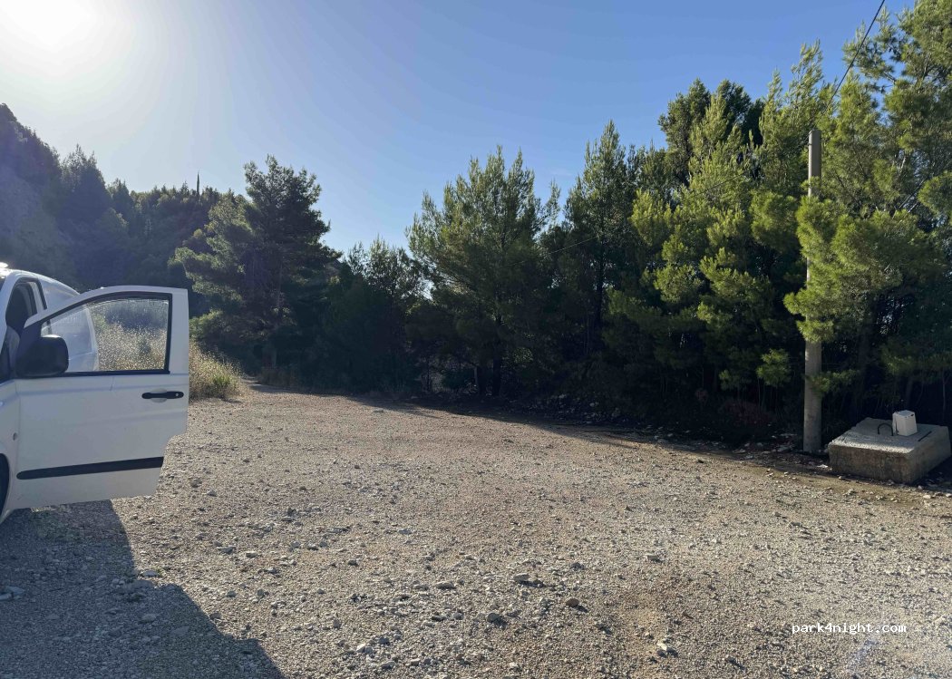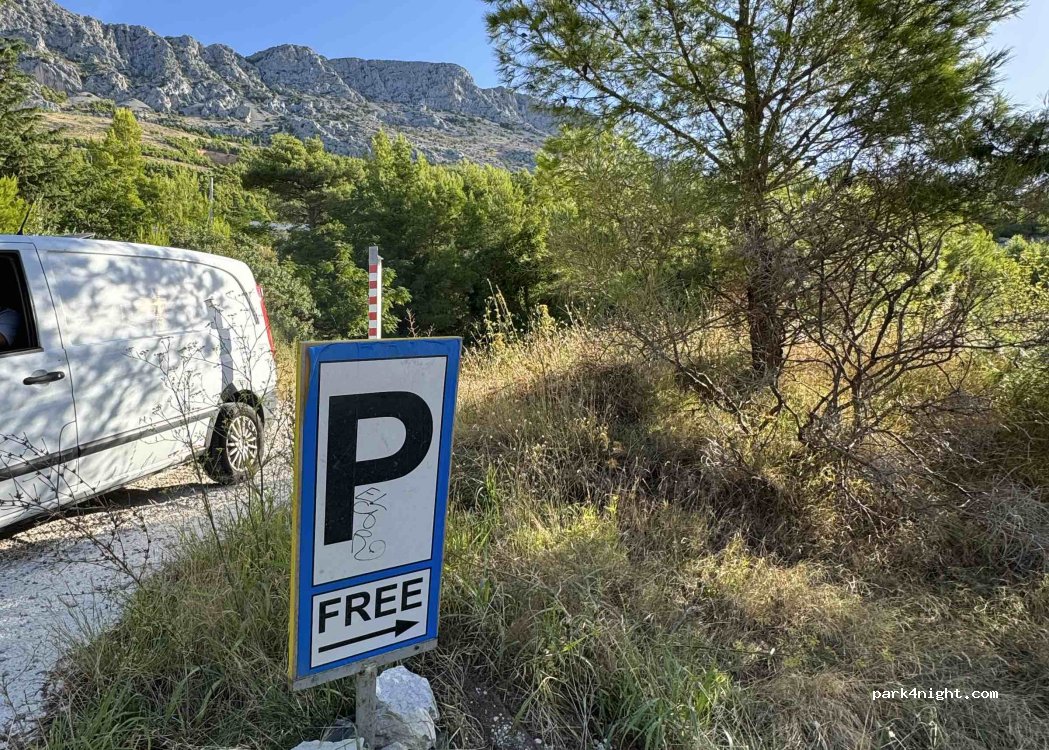 Free parking. Motorhomes can easily enter, but please be careful when entering and exiting. There is a barrier, but it's always open. A great spot – directly across the street is a beautiful beach with a bar. While swimming in the sea, you have a stunning view of the mountains. There's also a campsite nearby where you can shower if needed.