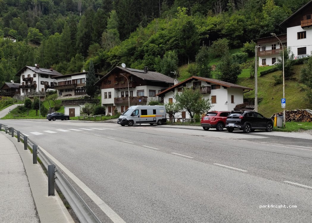 Se garer à Alleghe avec un camping-car ou un camping-car est difficile. Ce parking, situé à seulement 10 minutes à pied du centre-ville, offre un stationnement gratuit pendant trois heures avec une place de stationnement minutée. C'est une agréable promenade jusqu'au centre-ville avec vue sur le lac.