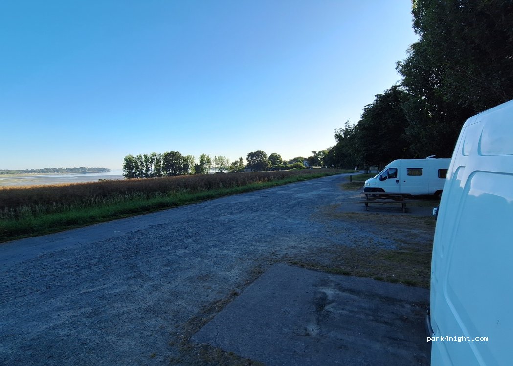 Ottima area di sosta un piano per circa una 20mm a si Van, con tavolini e panche. Pulita e con una bellissima vista sulla baia, dove si può apprezzare la marea. Va bene anche per dormire an eh se adiacente alla strada un po’ trafficata. Nessun servizio se non i cestini spazzatura.