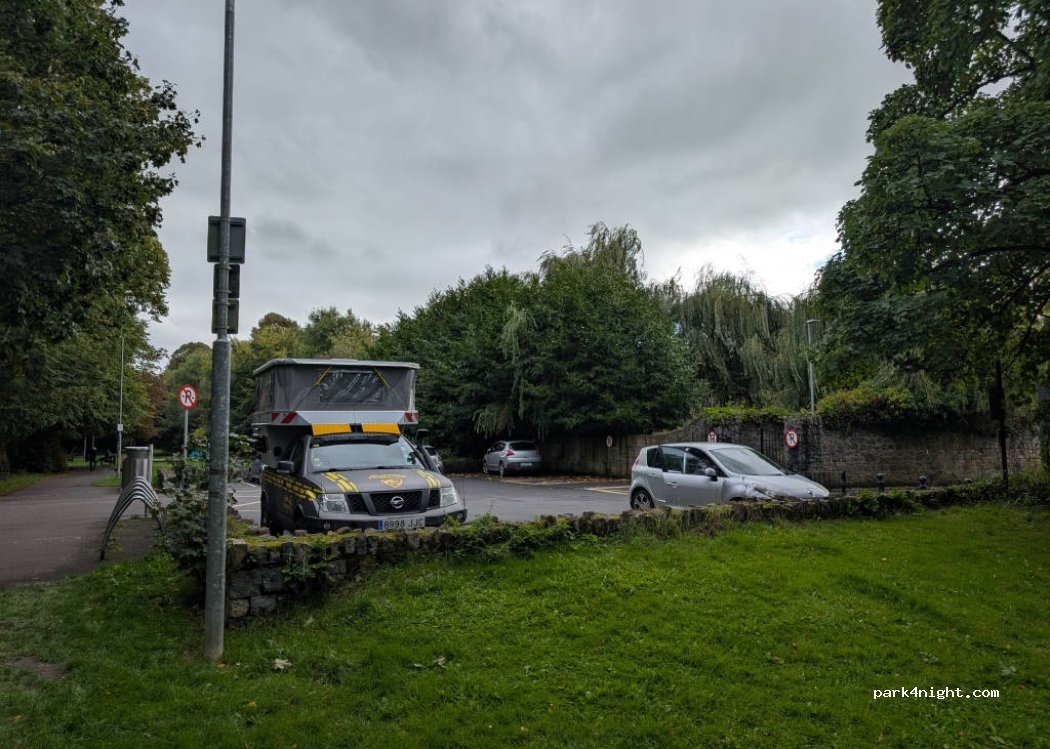 Pequeño aparcamiento en el parque, junto al Canal Walk en Kilkenny, con diez plazas en total. Hay espacio suficiente para maniobrar, aunque las plazas son algo estrechas, pero de largo no hay problema. Se recomienda no aparcar más de un camper o autocaravana a la vez para no sobrecargar el aparcamiento. Ideal para paseos con perros, con bancos de picnic justo al lado. En unos veinte minutos andando se llega al centro de Kilkenny y al castillo. No hemos pernoctado, solo pasamos a comer a mediodía, pero no vimos señales de prohibición para aparcar. Dicho esto , un señor nos dijo que por la noche algunos vienen a beber, aunque también hay un cartel que indica que está prohibido consumir alcohol. Aun así, para pasar la noche parece un sitio bastante tranquilo y con buena pinta.