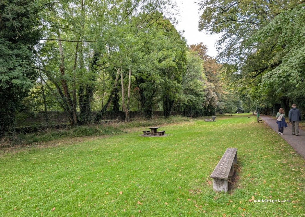 A small parking lot in the park next to the Canal Walk in Kilkenny, with ten spaces in total. There's enough room to maneuver, although the spaces are somewhat narrow, but the length isn't a problem. It's recommended not to park more than one camper or motorhome at a time to avoid overloading the parking lot. It's ideal for dog walks, with picnic benches right next to it. It's about a twenty-minute walk to the center of Kilkenny and the castle. We didn't spend the night, only stopping for lunch, but we didn't see any signs prohibiting parking. That said, a man told us that some people come here at night to drink, although there's also a sign indicating that alcohol is prohibited. Even so, it seems like a fairly quiet and pleasant place to spend the night.