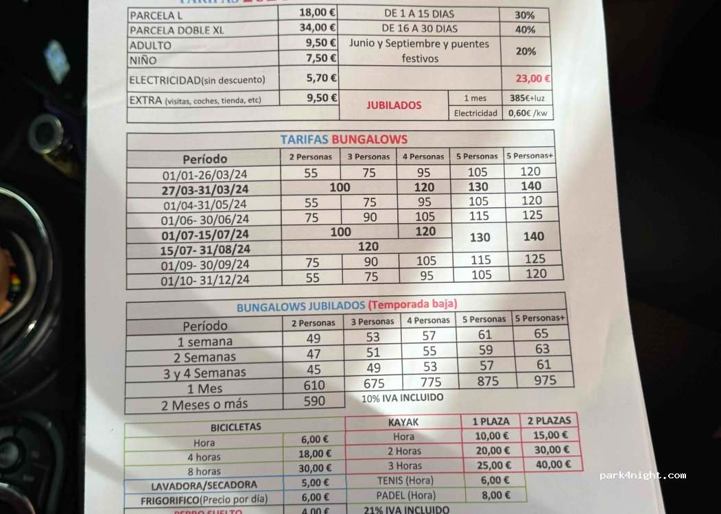 Precio por la pagina web y me parece estupendo. No muy alto Parcelas razonables. La gran mayoría tiene toldo para dar sombra. Dos bloque de Baños, uno la verdad mucho mejor que el otro. Suelo nivelado y con chinos. Piscina mediana. Lo único de lo que podría quejarme es que no dejan llevar sillas a la piscina ya que no hay nada donde sentarte o tumbarte a parte del suelo.