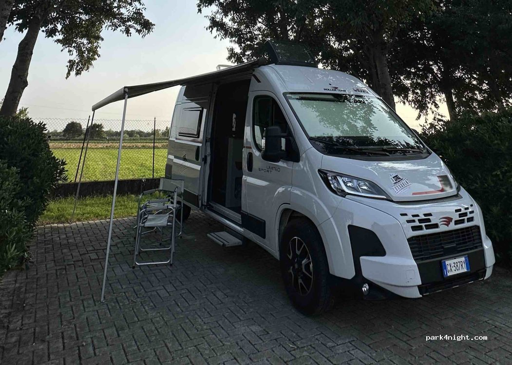 Rest area equipped with water and electricity, black and grey water loading and unloading. Bathroom with shower and sink for dishes and utensils. Excellent restaurant with a set menu, also €15 per person. A good base for visiting Lake Garda, which is not far away, or for those like me looking for a stopover on the way to Trentino. Not recommended for light sleepers. Unfortunately, the nearby highway is very loud at night, and there are also a livestock farm nearby, so there are quite a few flies. On the other hand, the bathrooms and restaurant are really clean. I would say the value for money is more than good.