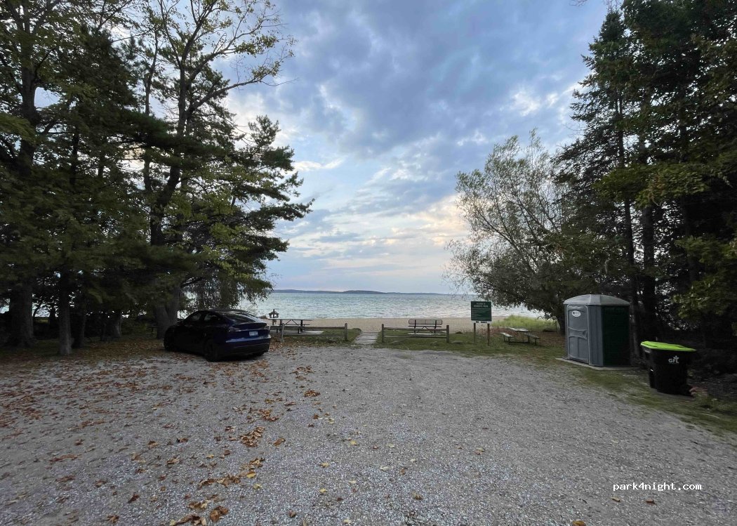 Nice little spot off a very quiet side road right on the bay with a beach and bathroom and parking for about 8 vehicles. I included a picture of the rules sign.