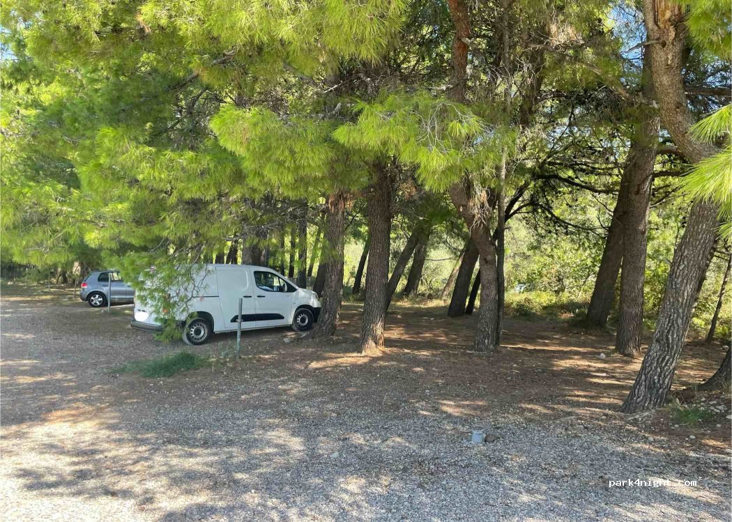 Estacionamiento bajo los árboles para nadar o caminar hasta las ruinas de la torre. Si continúa pasando las ruinas, encontrará más zonas con sombra y para nadar, y en algún punto (a unos 15 minutos a pie del estacionamiento) encontrará un parque infantil, un chiringuito, baños, duchas al aire libre, canchas de baloncesto y voleibol, y una zona de playa para perros. No es muy adecuado para coches grandes ni autocaravanas. Estuvimos aquí un domingo a finales de septiembre y el chiringuito cercano estaba cerrado.