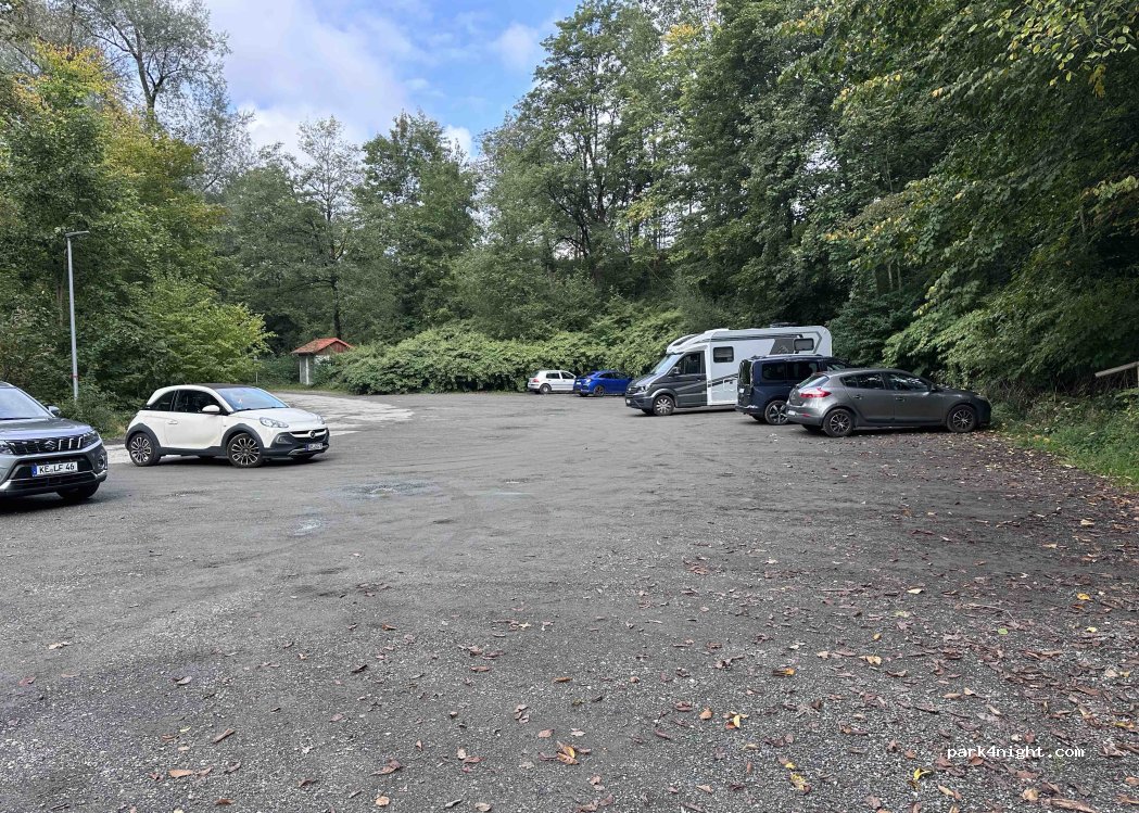 Aparcamiento llano, a 1,5 km del centro de Kempten, en el Parque Paisajístico Engelhalde. Al lado había una torre de escalada y una pista de patinaje. La cafetería y los baños (¿públicos?) estaban cerrados, y había una máquina expendedora al lado. Solo estuvimos allí para comer. No vimos ninguna señal de prohibición.