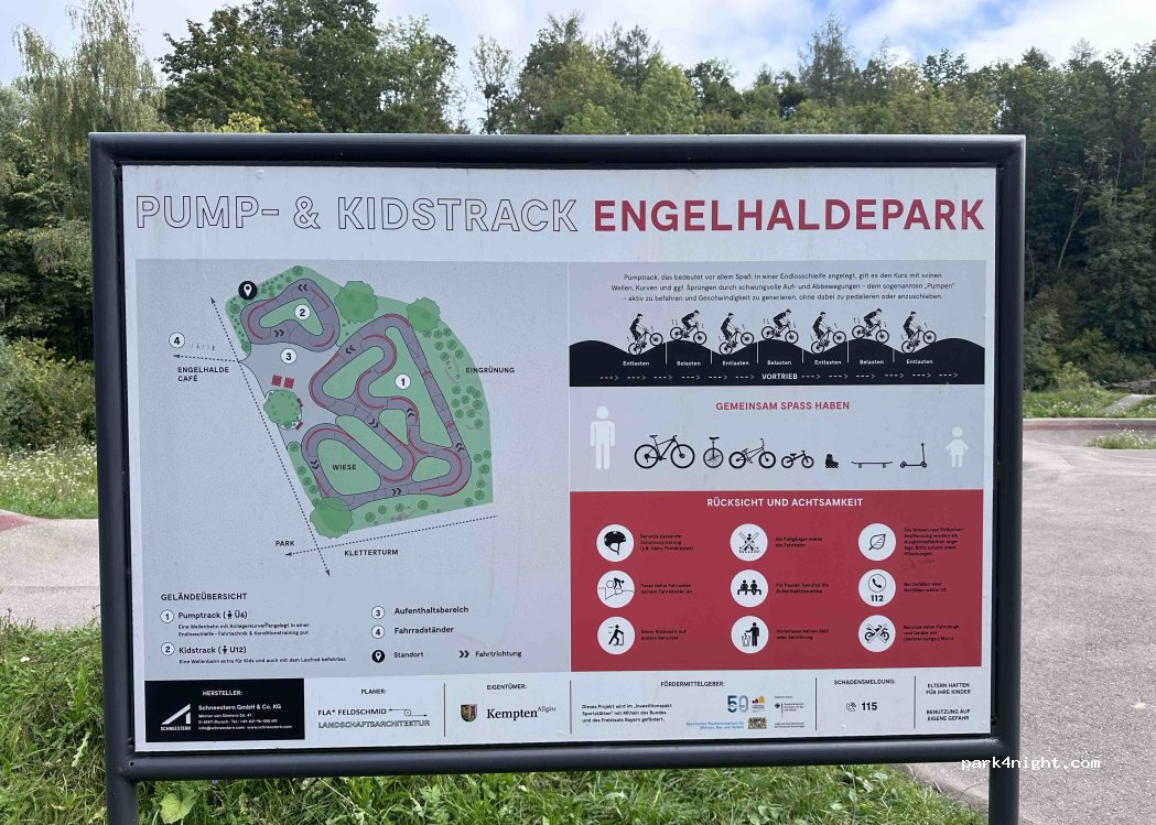 Ebener Parkplatz, 1,5 km vom Zentrum Kemptens, im Landschaftspark Engelhalde. Kletterturm und Skatepark daneben. Das Café und die (öffentlichen?) Toiletten waren geschlossen, ein Getränkeautomat daneben. Wir waren nur zur Mittagspause hier. Haben keine Verbotsschilder gesehen.