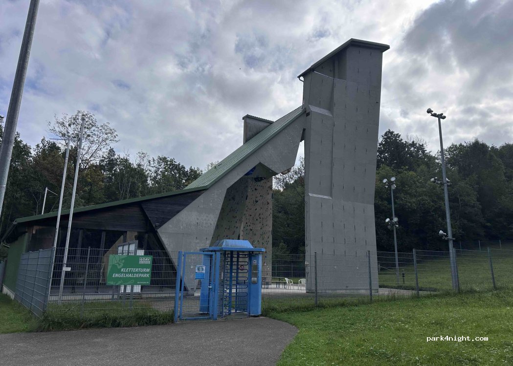 Level parking lot, 1.5 km from Kempten's center, in the Engelhalde Landscape Park. A climbing tower and skate park were next door. The café and (public?) restrooms were closed, and there was a vending machine next door. We were only here for lunch. We didn't see any prohibition signs.