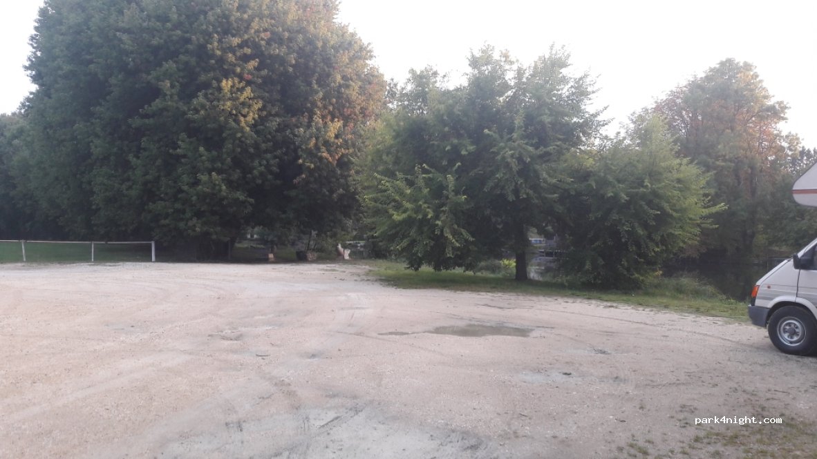Parking en sablette au bord d'une rivière et d'un stade. Nous y avons passé la nuit. Très agréable et plat.