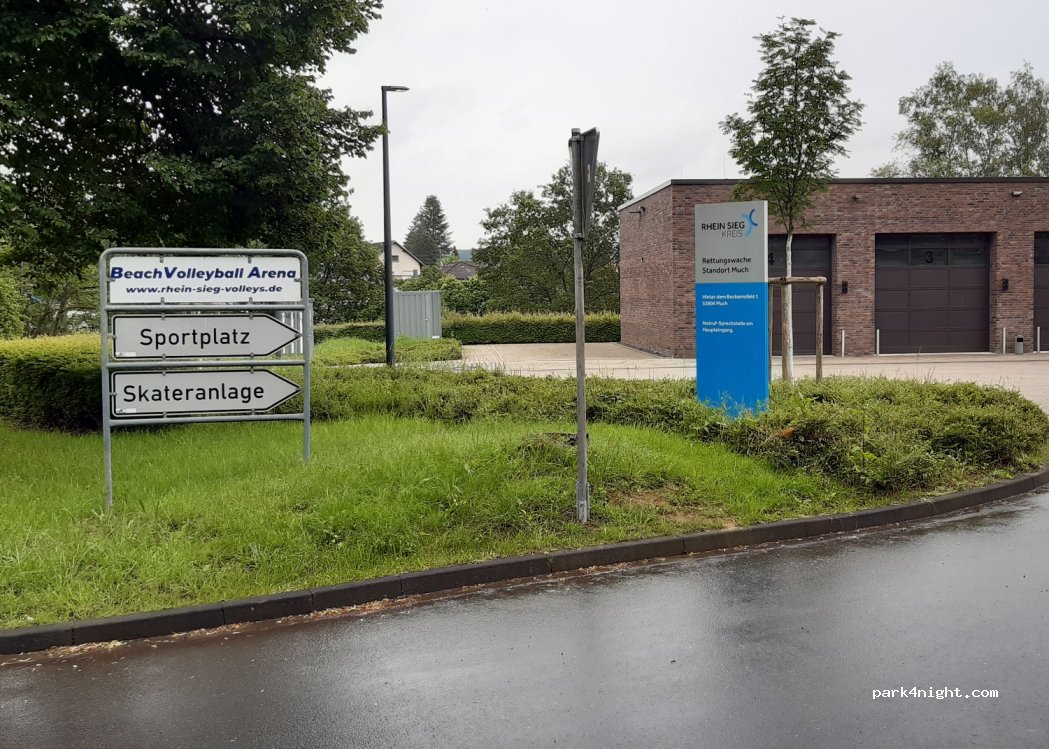 Einfahrt gleich neben der Rettungswache Much, Schild zum Sportplatz folgen. Schöner und sauberer Platz. War für 1 Nacht hier. Nachts hört man ab und an ein Flugzeug. An der Sakterbahn geht ein kleiner Weg in den Wald (Trimmpfad), in dem man schön mit dem Hund laufen kann.