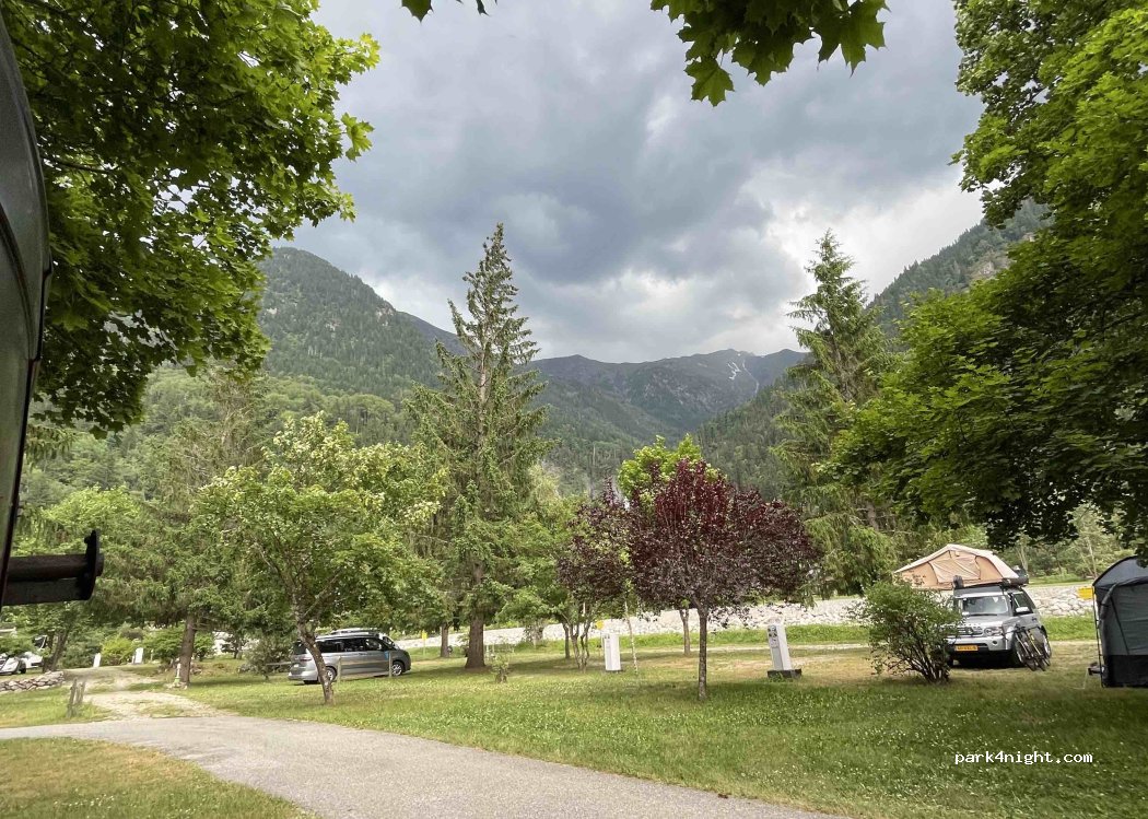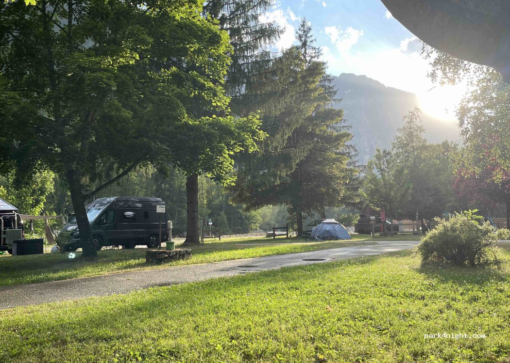 Camping muuuy bonito, impresionantes vistas de las montañas y del río que pasa por al lado, parque infantil... pero un poco caro... dos adultos y dos niños, sin electricidad, con autocaravana 31€ y el checkout es a las 12h
