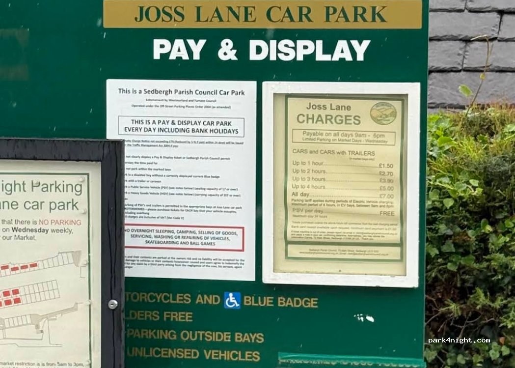 One parking space in a small car park in the lovely little town of Sedbergh. Pay at the metre. Wednesday is market day so the car park is busy and has fewer spaces. No overnight camping.