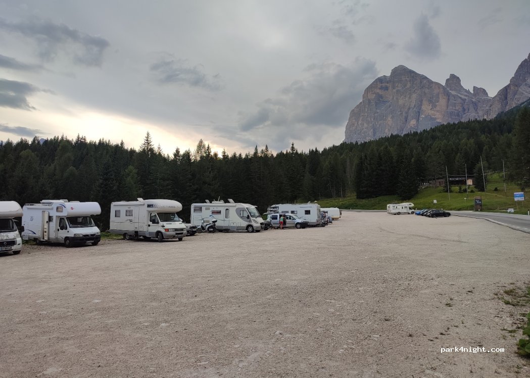 Très grand parking. Très bruyant, malheureusement, route, bien fréquenté (artère principale menant à Cortina D’Ampezzo). Et spot très connue et voyant:beaucoup d’autres, camping-cars . En revanche faire attention où se garer en cas de pluie .