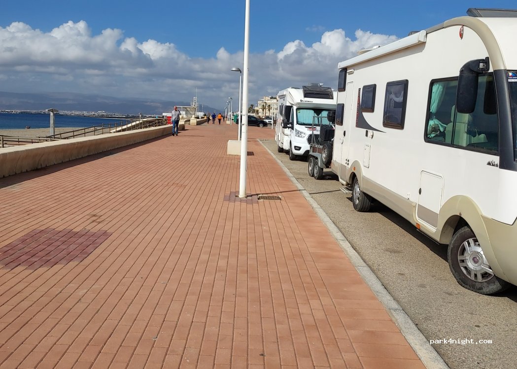 Schöner Platz mit Blick auf Cabo de Gata-Níjar. Meer, Kies-/Sandstrand und wenig benutzte Promenade. In ca. 500 m einige Restaurants an der Promenade. Die Duschen am Strand mit kaltem Wasser. Okay, für eine Nacht mit Meeresrauschen!