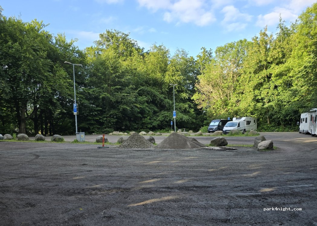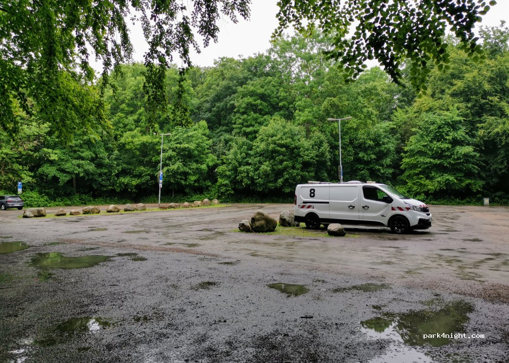 Gemütlicher Parkplatz in einem kleinen Wald. Ein kurzer Weg führt direkt zum Strand, bei dem sowohl die Toiletten wie auch der Steg ist. Mülleimer auf dem Platz und kleine Recyclingstation am Strand bei den WCs. Tagsüber im Sommer ist der Parkplatz wohl ziemlich voll v.a. mit PkWs. Nachts kostenlos, tagsüber mit Parking-App bezahlbar.
