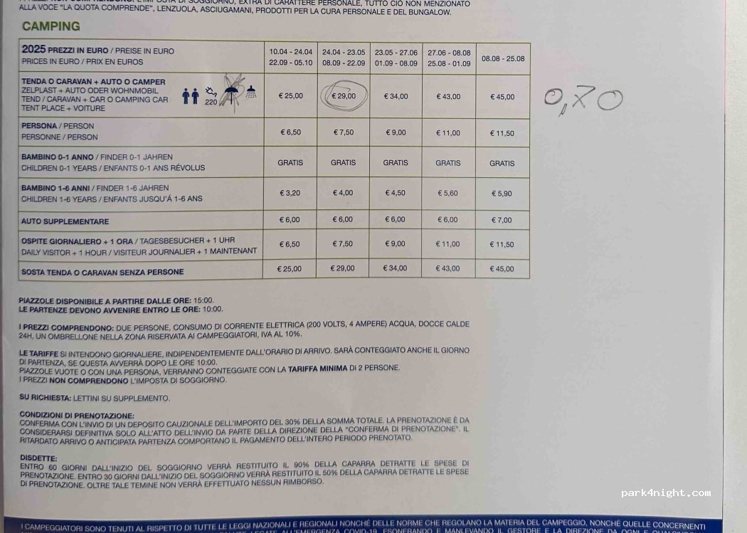 Akzeptabler Campingplatz sehr nah am Strand und guter Ausgangspunkt für Ausflüge nach Chiaggio und Valencia. Ungefähr 23€ pro Nacht (1 Person plus 1 Campingbus). Sanitäranlagen teilweise sehr alt, aber meistens sauber. Pro Woche 1GB kostenloses Wlan, mir reicht das nicht. Es gibt keinen Blick auf Strand oder Meer, vor Beginn der Hochsaison war noch vieles Baustelle und zugestellt.