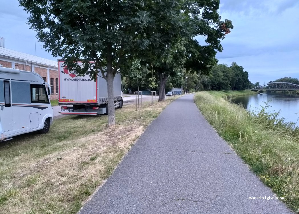 We spent an evening in the city park and skatepark. After finishing shopping we moved to this place just accross the river Labe and spent a night here. It was just right for us. No disturbing at night (the railway bridge was under reconstruction), a few cars in the evening and in the morning. The production in the factory started at around 6:30 in the morning with loud music.
