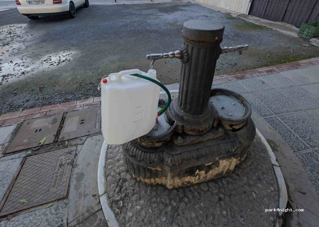 Ausgezeichneter Trinkbrunnen mit Doppelhahn (gewindelos und mit Knopfdruck). Guter Wasserdurchfluss, der 20-Liter-Tank ist in ca. 3 Minuten voll. Einbahnstraße, gerade und gut erreichbar, aber Sie müssen am Straßenrand einen Parkplatz suchen.