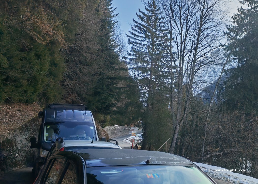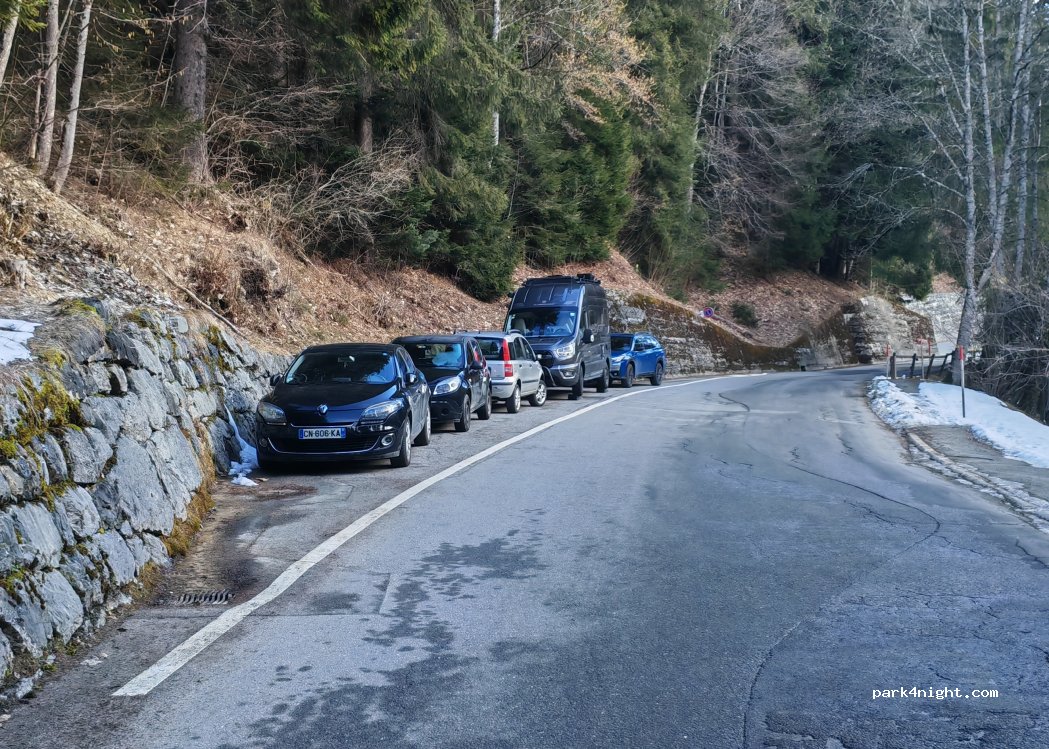 It's possible to spend the night in the 3-4 parking spaces along the road. Parking is free, unlike the spaces closer to the trailhead (snowshoeing, cross-country skiing, ski touring, etc.) towards Solalex.