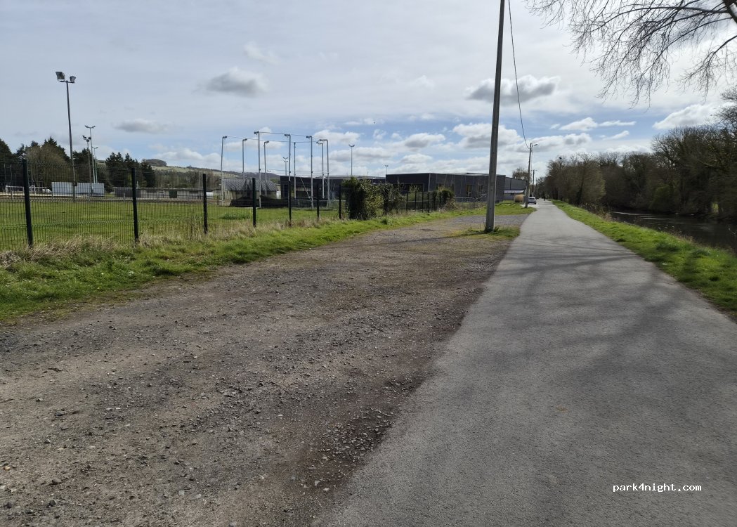 Parking by the stream on a cycle path behind the municipal stadium; no parking restrictions day or night.