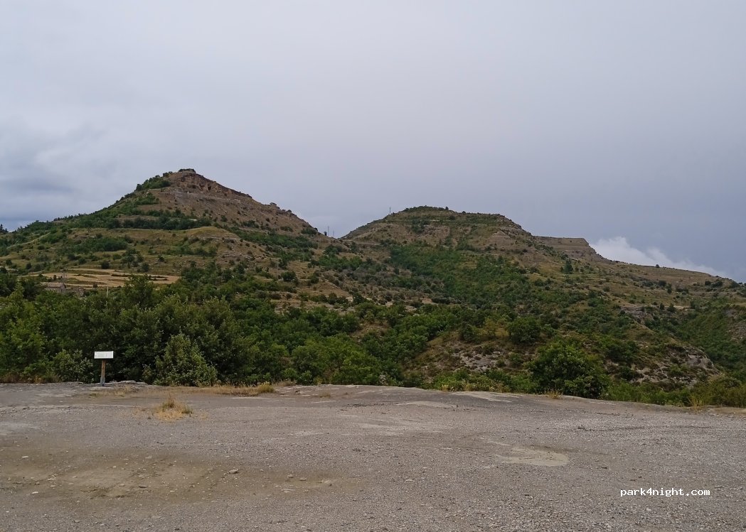 Schöner großer Schotterparkplatz an einer sehr ruhigen Straße. Das Panorama reicht von den Pyrenäen über die Serre del Montsec bis zur Mont-Rebei-Schlucht.