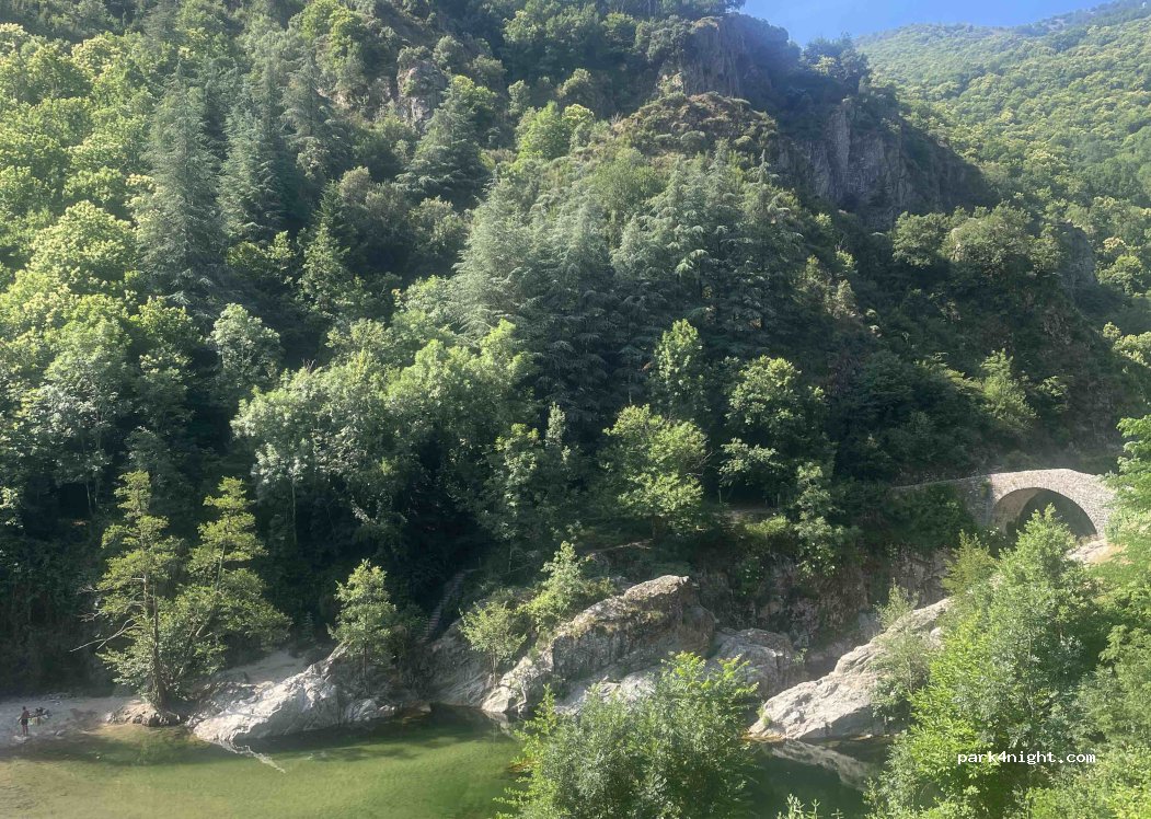 parking avec vue très sympa sur le pont et la plage en contrebas pour se baigner. Barrière à 2m18. guinguette qui loue du materiel de viagerrata. avec toilettes à côté mais accessible seulement aux horaires d'ouverture 10h-19h. paisible et plat. ombragé et soleil grand parking de gravillons tables de pique nique. Poubelles de tri. départs de nombreuses randonnées.