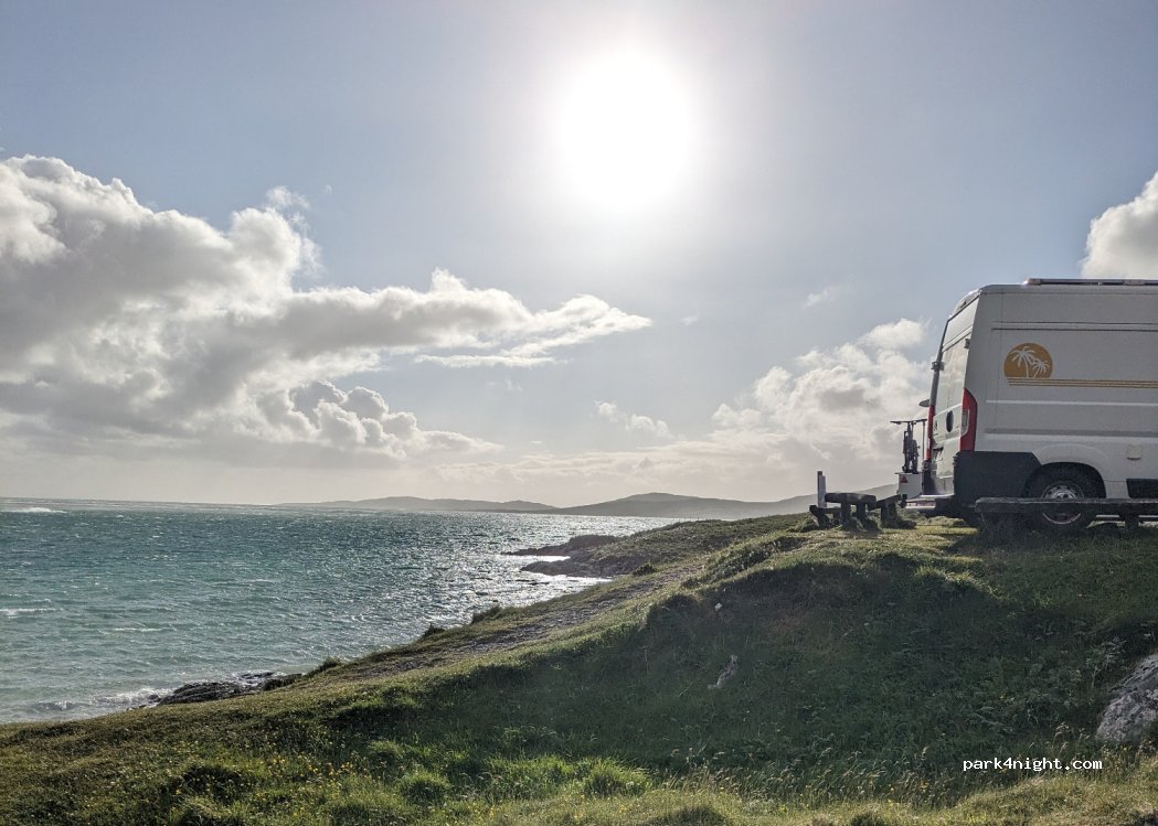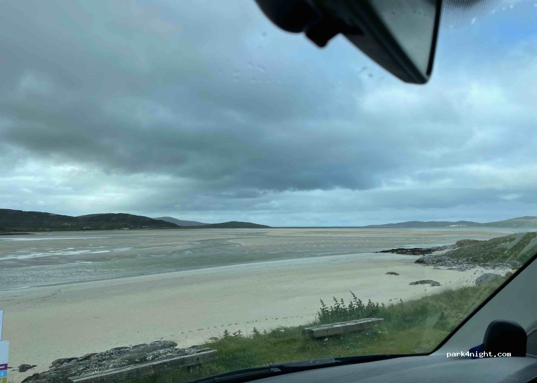 Beautiful view of the beach. Can easily fit 4-5 vans here, if everyone parked OK. One should pay the £5 to the Harris Trust, if you stay here over night. It's for a good cause.