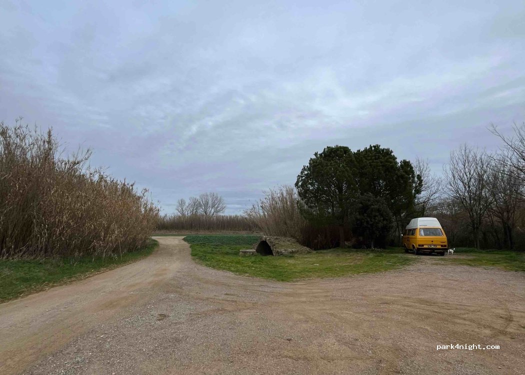 Lugar tranquilo y seguro. junto a un puente romano, cultivos y una vía secundaria medianamente transitada. En las mañana pasan algunos ciclistas o caminantes. Había mucha basura lo que es muy triste, por esta zona no es fácil encontrar un buen lugar. Cuidemos el entorno para seguir siendo bienvenidos!!