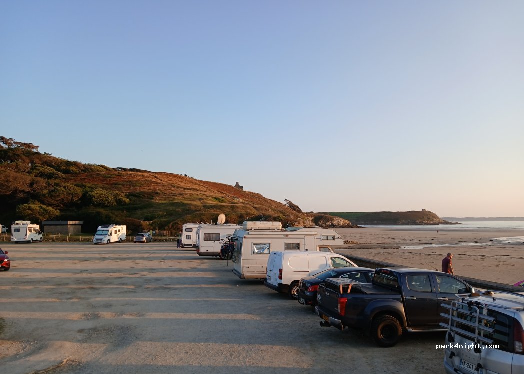 franchement meilleur spot pour dormir qu'on ait eu en Bretagne. bien sûr les horaires a respecter mais la vue est imprenable il y a de la place malgré qu'on y était la semaine du 15 août c'est plat et on peut y manœuvrer même avec un grand CC. les toilettes sont mal indiqués et moyen propres mais ça dépanne