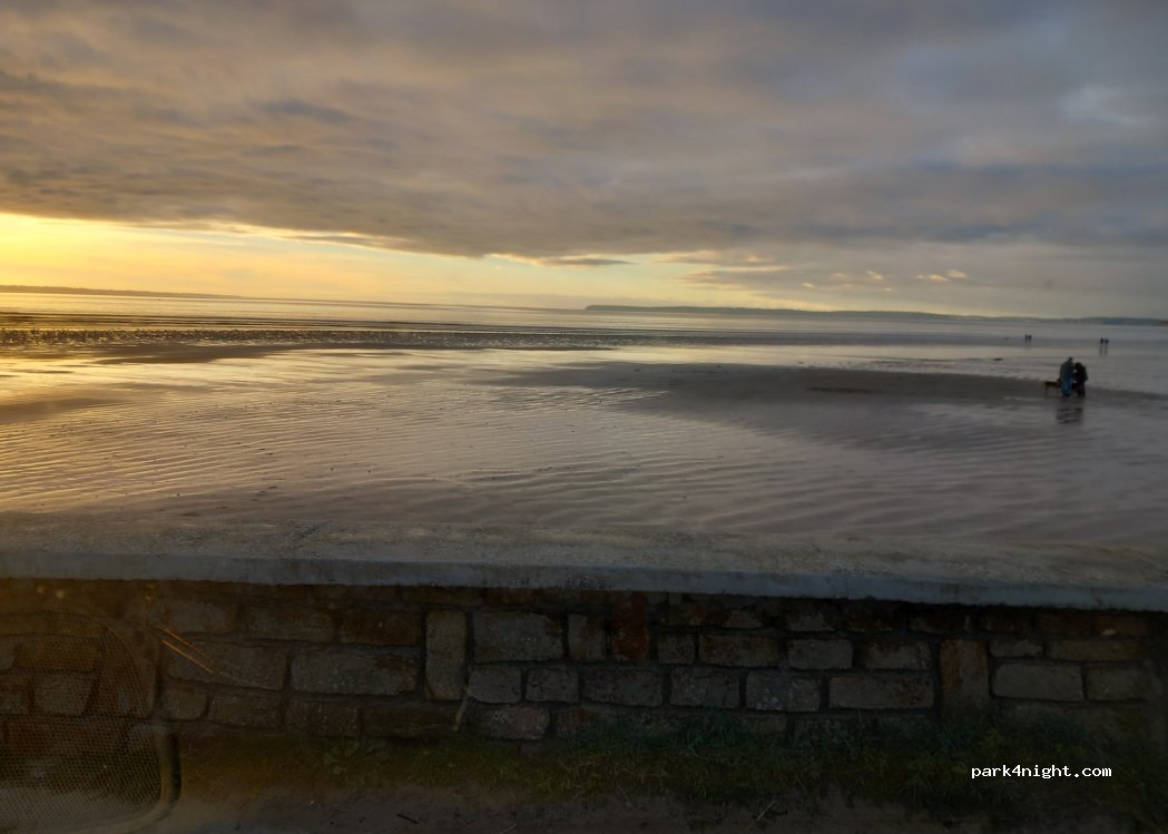 Spot de ouf malgré la route 100m derrière nous mais peu passante la nuit. Vue directe sur l immense plage et hier le top, concert de cornemuses sur la plage. Coucher de soleil magnifique. WC OK. top