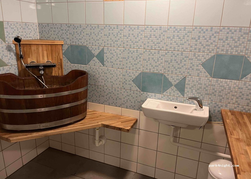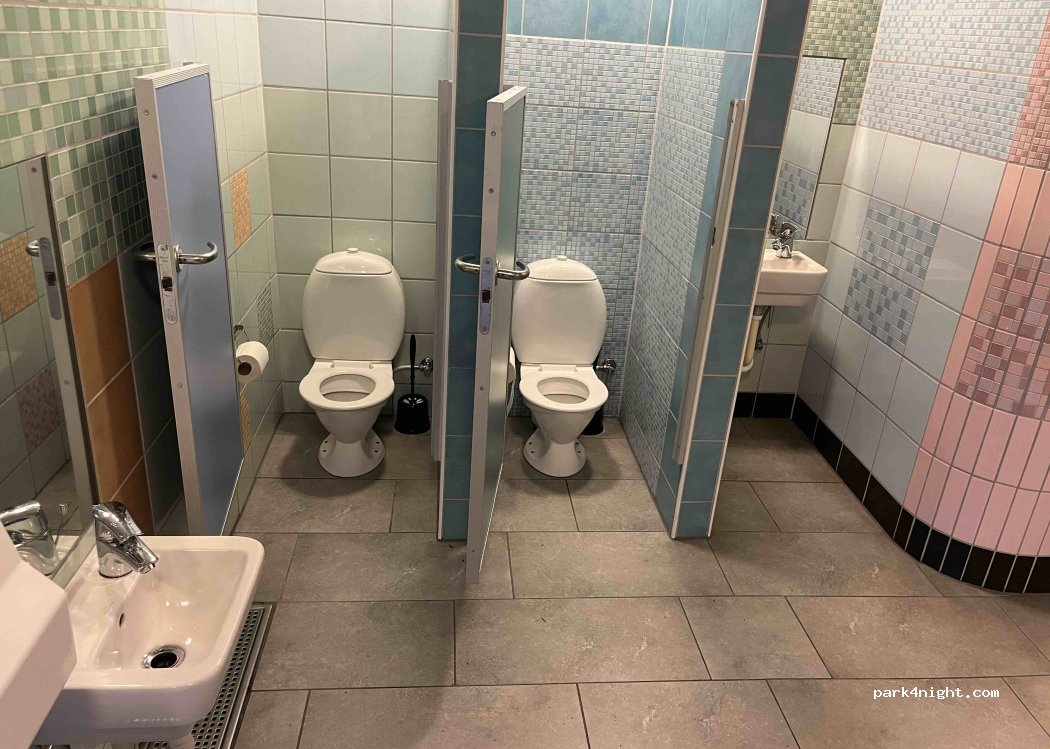Camp West campground. Impeccable campsite with modern facilities. Playground for children, kitchen with several gas stoves, ovens, microwaves, indoor dining room, barbecue, sanitary facilities for children (too cute), washing machine, dryer. Spacious location. Electricity is not included in the price, we have to pay what we have consumed. Pleasant manager who speaks very good English.