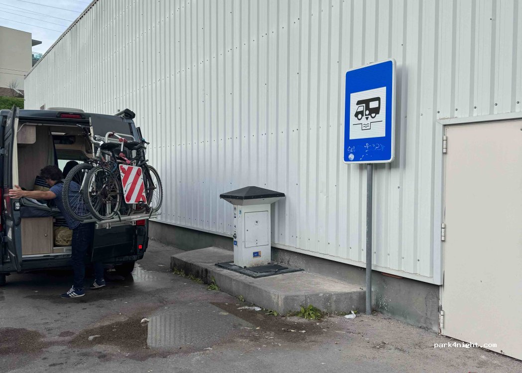 Handy place with water charge and discharge, and a laundromat that we didn't use. Fresh water costs 2 euros for 100 litres/10 minutes. The token for it must be collected in the supermarket beside. A bit of smell from dark waters not being discharged properly.