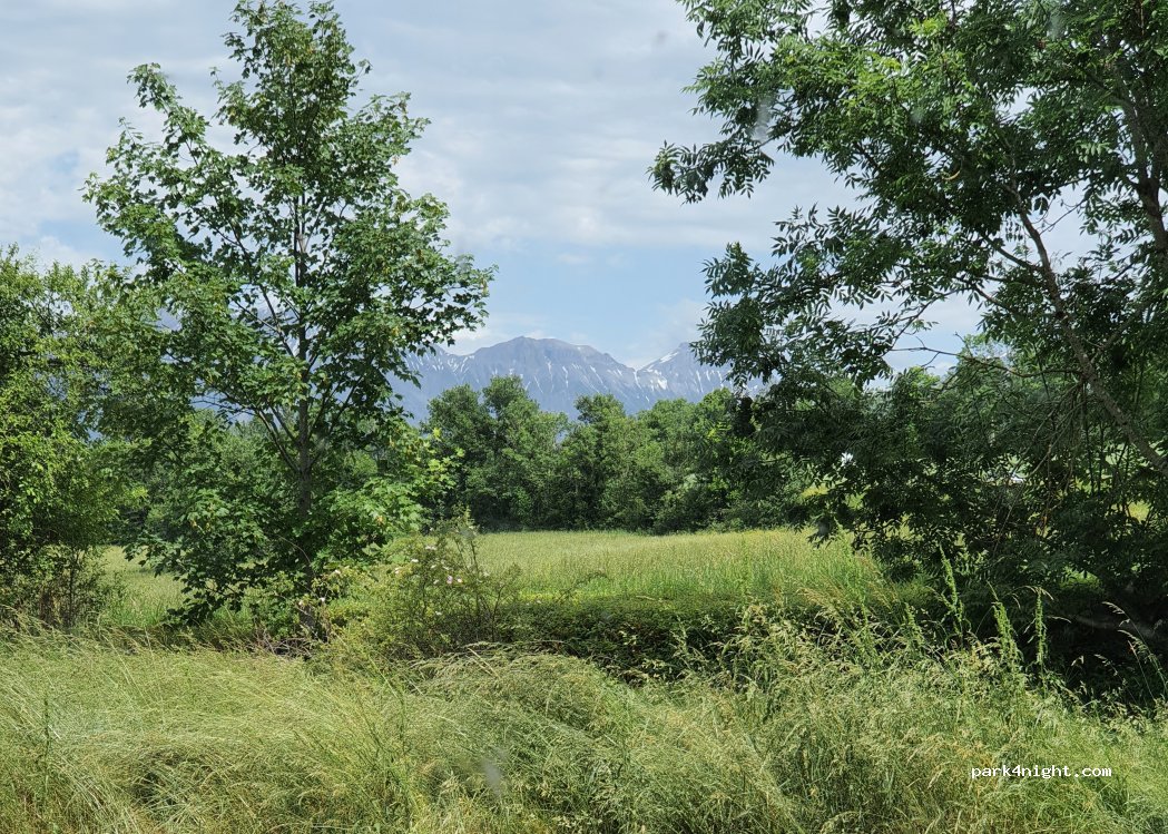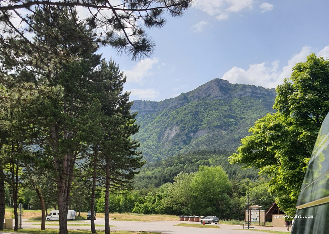 grand parking, parfait pour une nuit d'étape. Belle vue sur le massif du Vercors. Calme malgré la proximité de la route