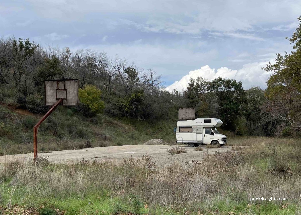 Very quiet place in an old abandoned sports complex at the end of a road. Large carpark area in between a football field and a basketball court. Don't follow google maps because it says there's a small bridge crossing just next to the entrance, but there isn't one. You have to come through the small village of Loutros on the western side of the river. The road is sealed all the way to the area.