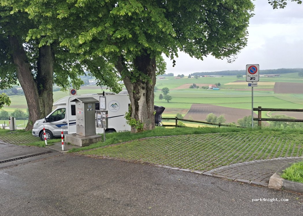 Avons fait une halte déjeuner avec notre Van. Eau et électricité à disposition ! Nous avons vidé les eaux grises sans souci. Jolie vue sur la campagne suisse. Parfait pour nous !