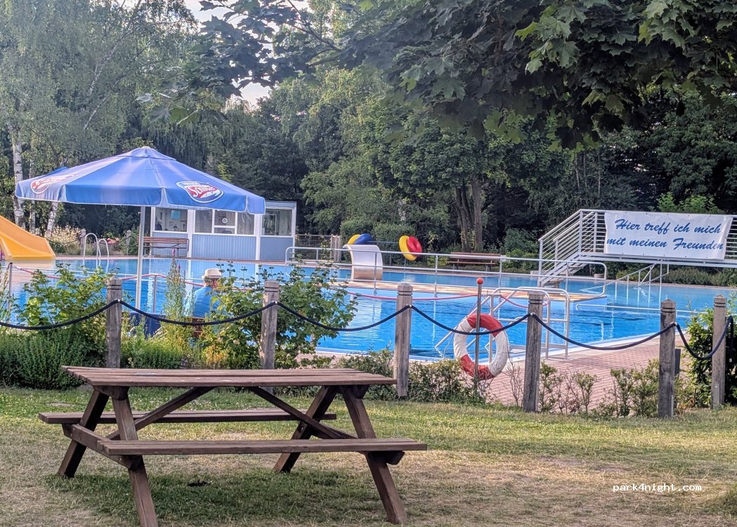 Prima Stellplatz neben Schwimmbad, durch Hecke von der Straße abgetrennt. V/E vorhanden, Wanderkarte, was kann man bei einem kostenlosen Platz sonst noch erwarten?