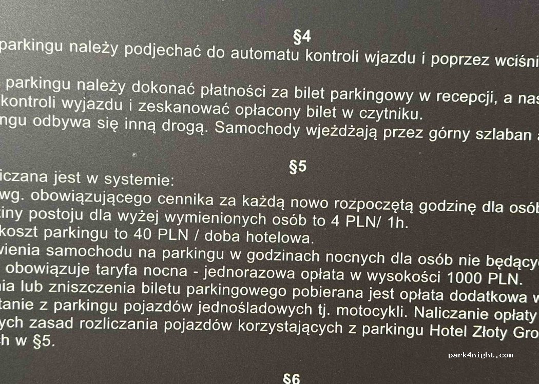 Bardzo fajny parking. 40 zł opłata dla gości hotelowych. Przy nocowaniu w kamperze opłata 100 zł. Warto podejść do recepcji zaraz po przyjeździe a nie rano. Przy zgłoszeniu się rano kolejnego dnia po przyjeździe doliczają opłatę taryfy nocnej i koszt postoju to 1000 zł. Także można się zdziwić .